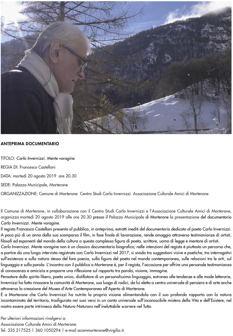 Martedì 20 agosto 2019 presso la sala municipale verrà presentata l'anteprima del image documentario Carlo Invernizzi. Mente voragine. (176 KB)